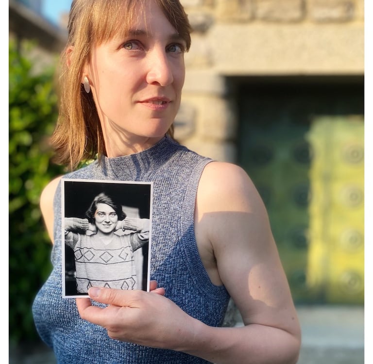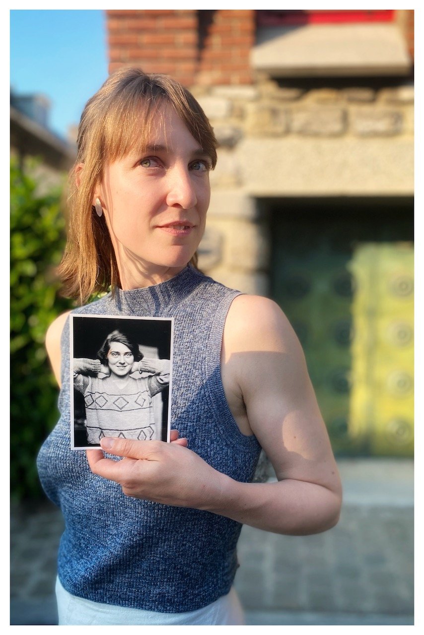 Adèle pose ici devant la maison de son aïeul, Louis Pion.